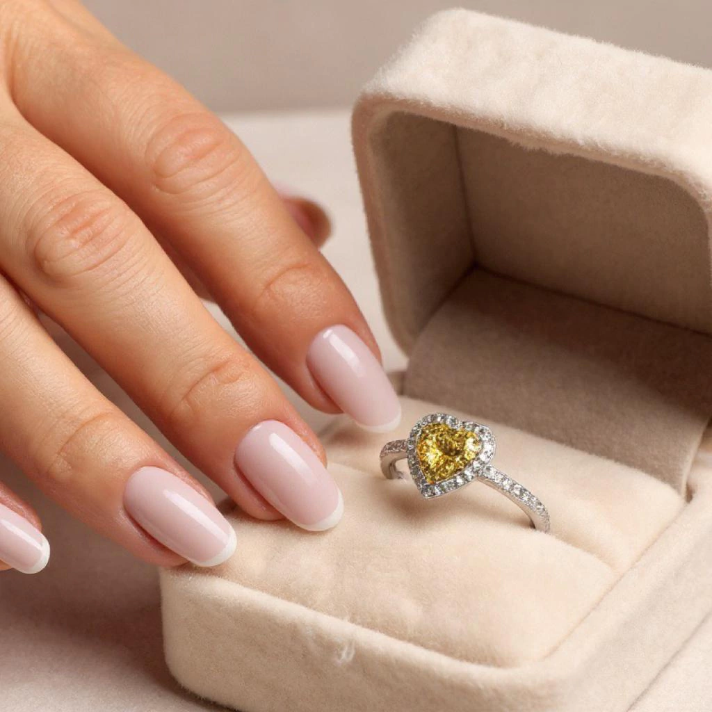 Este anel banhado em ródio branco destaca-se pelo pingente de coração em pedra zircônia citrino, irradiando charme e sofisticação. As bordas cravejadas com zircônia cristal conferem um brilho sutil que valoriza qualquer ocasião, do dia a dia a eventos especiais.