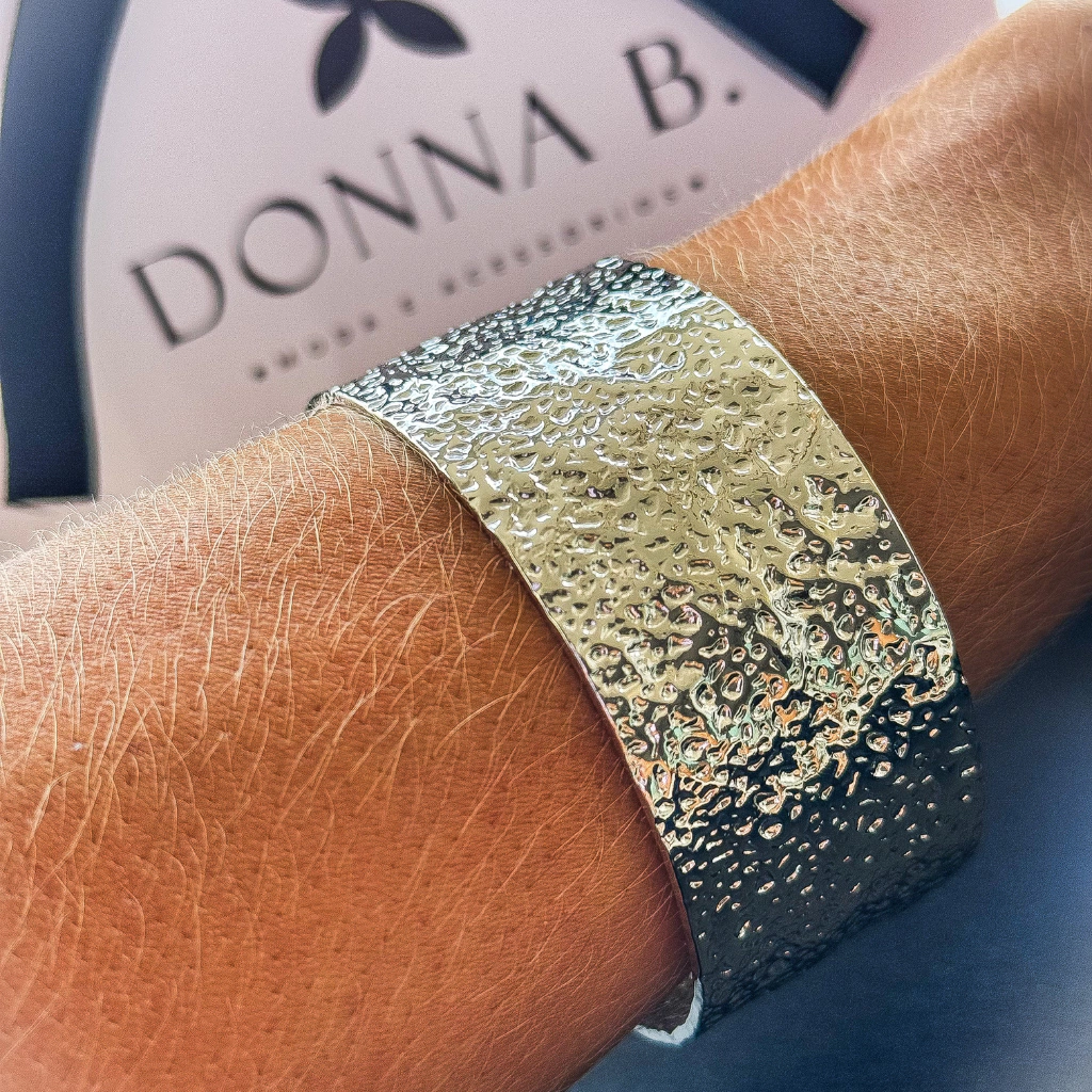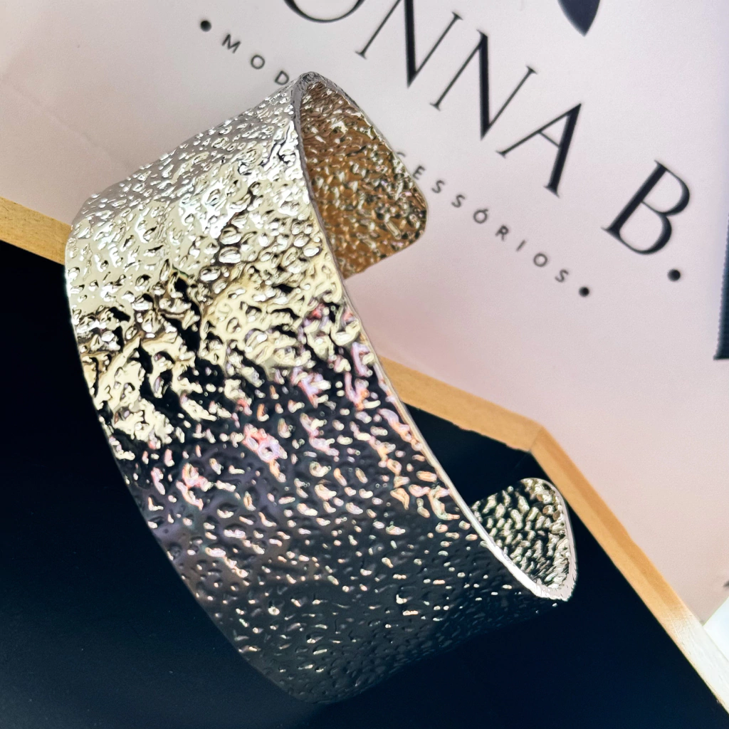 Bracelete no banho de ródio branco, regulável, com textura martelado.